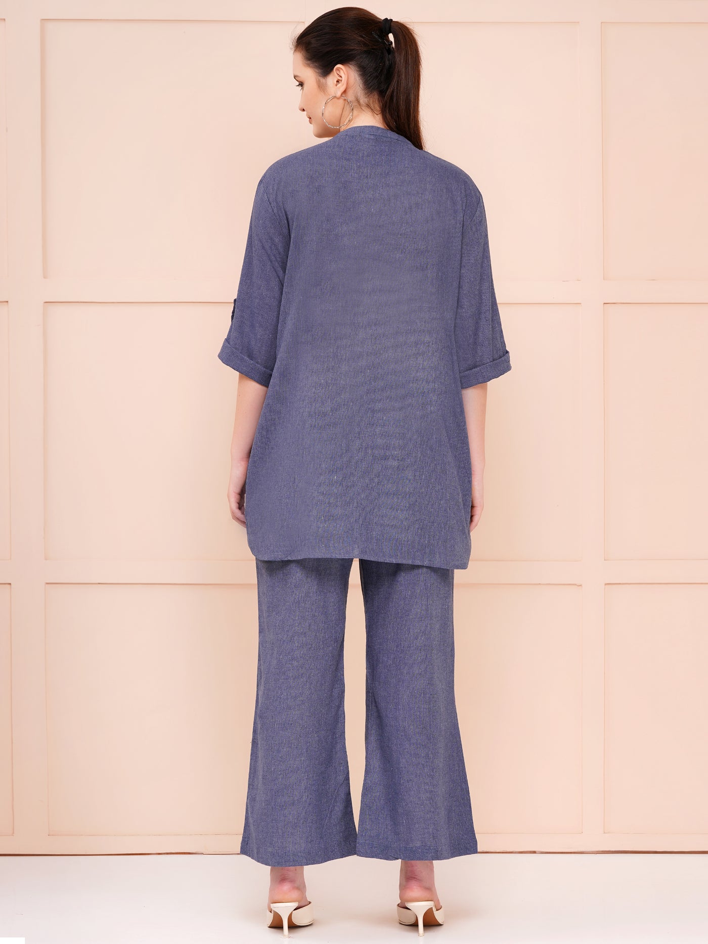 Cotton flax co-ord set for women grey color, designed exclusively for the modern woman who values both style and comfort. This exquisite set is part of our collection of Stylish Cotton Flax Co-ord Sets for Women, crafted from premium quality fabrics to ensure breathability and durability, making it ideal for year-round wear. The standout feature of this ensemble is the Flax Looped Sleeves Top with Flared Bottom, which adds a graceful silhouette and fluid movement, flattering every body type with ease. The Mandarin Collar Cotton Flex Solid Colors Co-ord Set offers a structured yet soft neckline that enhances the sophisticated look, suitable for both casual and semi-formal occasions. Our Grey Cotton Linen Mandarin Collar Co-ord Sets combine traditional cotton flax fabric with contemporary design elements. The soft texture and natural fibers provide exceptional comfort, making this an ideal choice for casual wear co-ord sets for woman who want to look effortlessly chic without compromising on ease of movement.