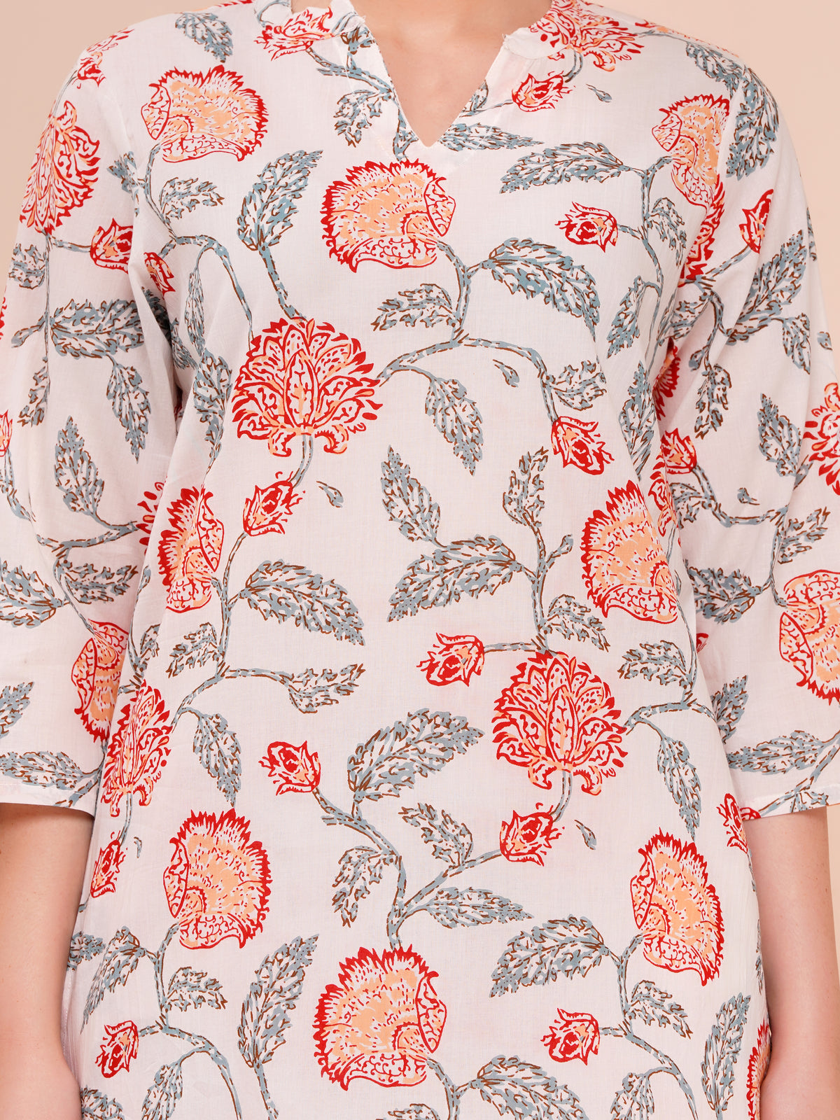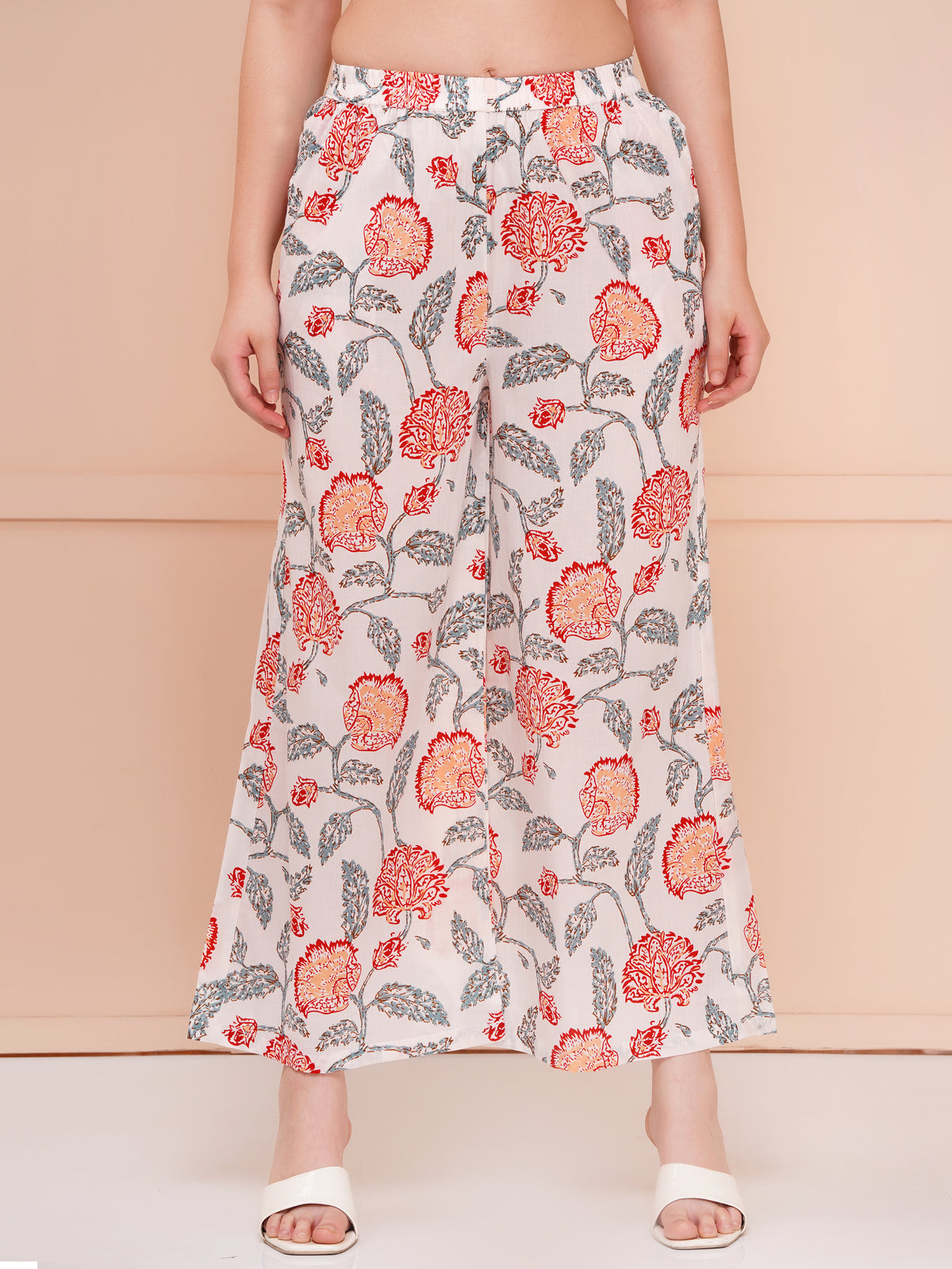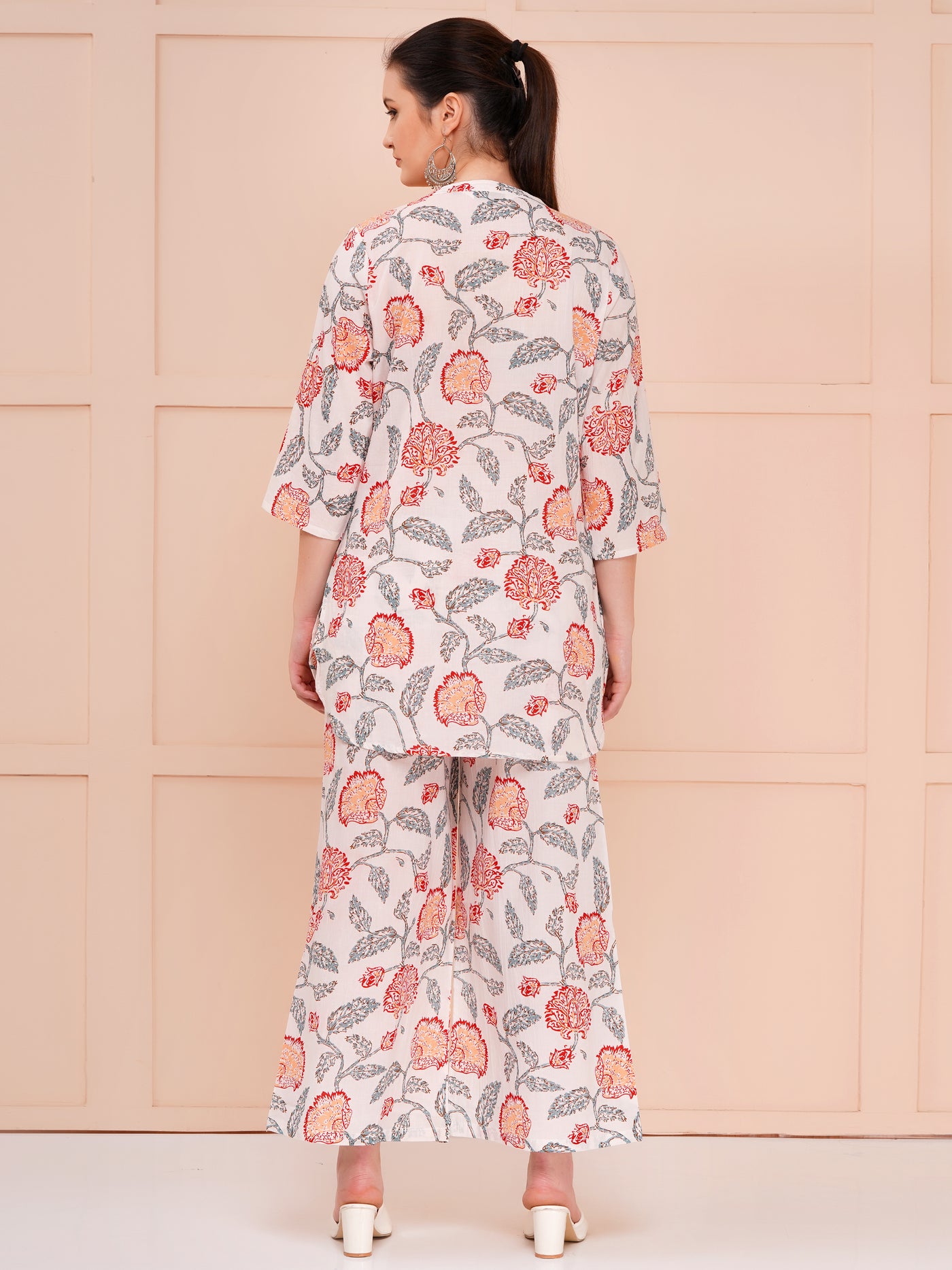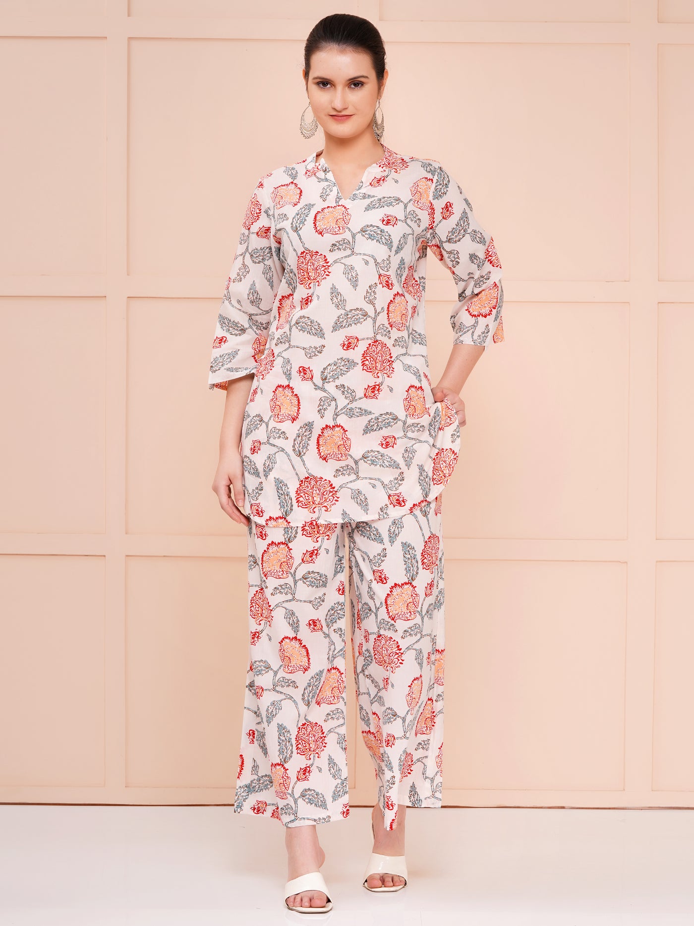 Cotton printed co-ord set for women white & multicolor, crafted to blend vibrant style with unbeatable comfort. Our Multicolor Floral print co-ord set is designed for women who love to express their personality through bright, fresh colors and intricate floral patterns. These Multicolor Floral cotton co-ord sets for women are made from premium quality cotton fabric, ensuring breathability and softness, perfect for any season. Each Multicolor Floral Printed cotton co-ord set features a harmonious blend of colors that make the floral prints pop, adding a touch of elegance and playfulness to your everyday wardrobe. This Floral Co-ord set for woman is ideal for casual outings, brunch dates, or relaxed weekend wear, combining both style and practicality. Our printed cotton comfortable co-ord set is designed with your comfort in mind. The fabric is lightweight and airy, making it perfect for casual wear while maintaining a chic appearance. The standout feature of these sets is the Looped Sleeves Top with Flared Bottom, which offers a flattering silhouette that enhances your figure while providing ease of movement.